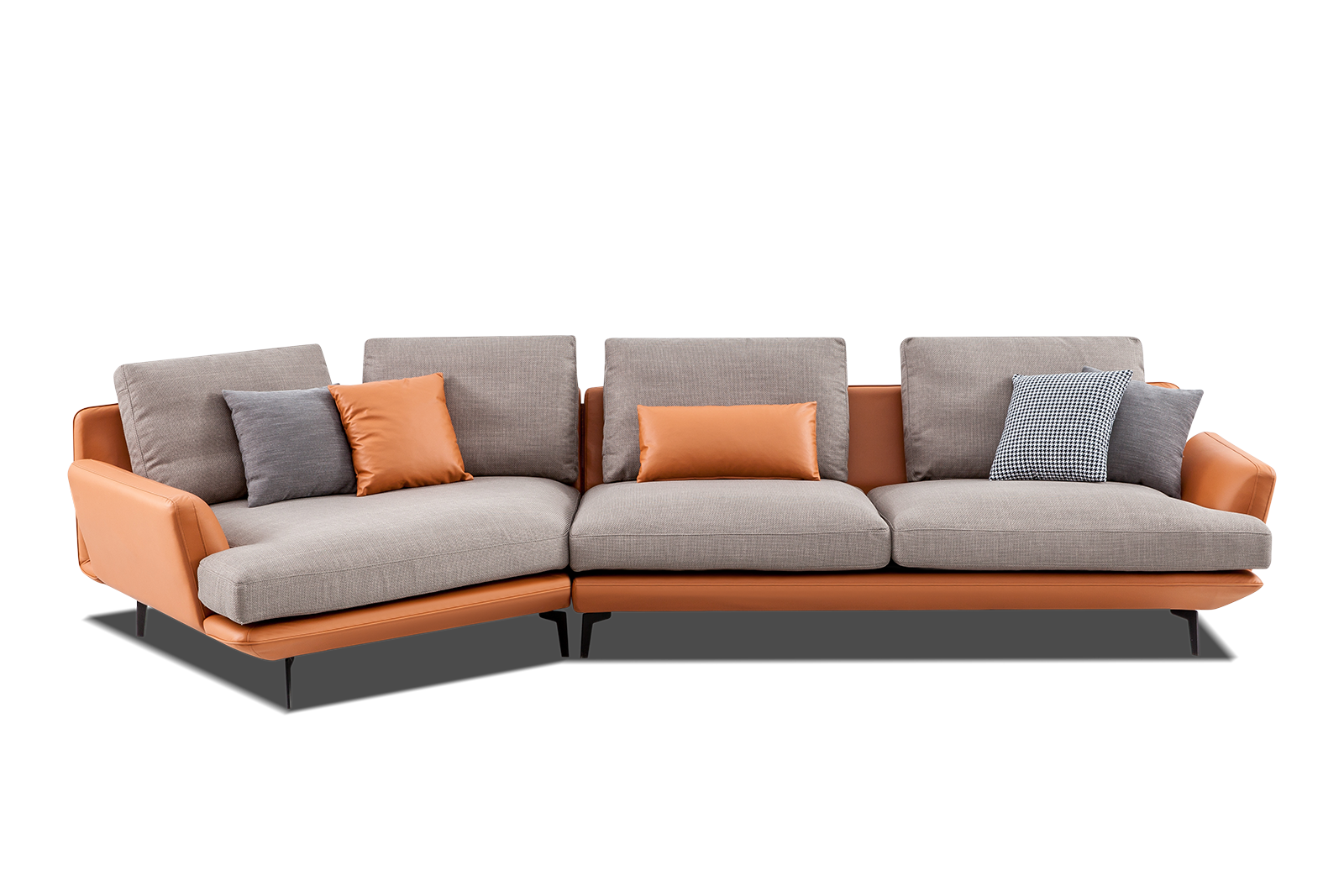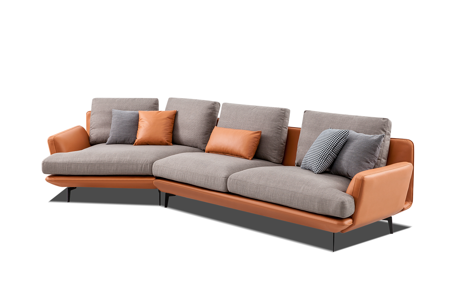 清新的雙色搭配,仿佛能聞見淡淡柑橘的味道;扶手充滿設計感,微微外傾的的弧度讓手臂自然搭放;異形轉角的環抱設計尤為吸睛,寬大的貴妃塌任躺任臥。